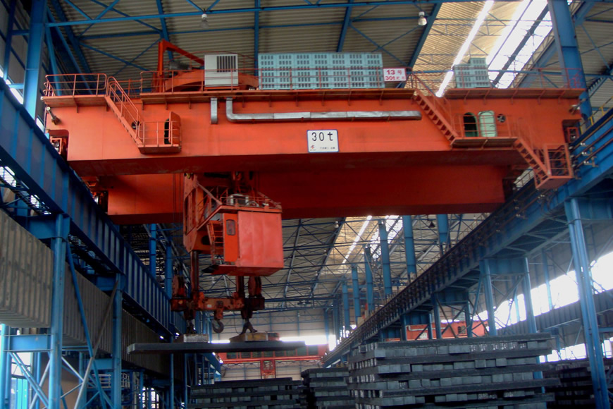 板坯夹钳起重机(又称板坯搬运起重机)是搬运板坯特别是高温板坯的专用设备。大连重工研制的板坯夹钳起重机有四大类,分为:板坯夹钳、钢板夹钳、钢卷夹钳、钢锭夹钳,共十几种机型,规格包括:20t、30t、36t、40t、45t、50t、56t、63t、70t、94t、100t 。